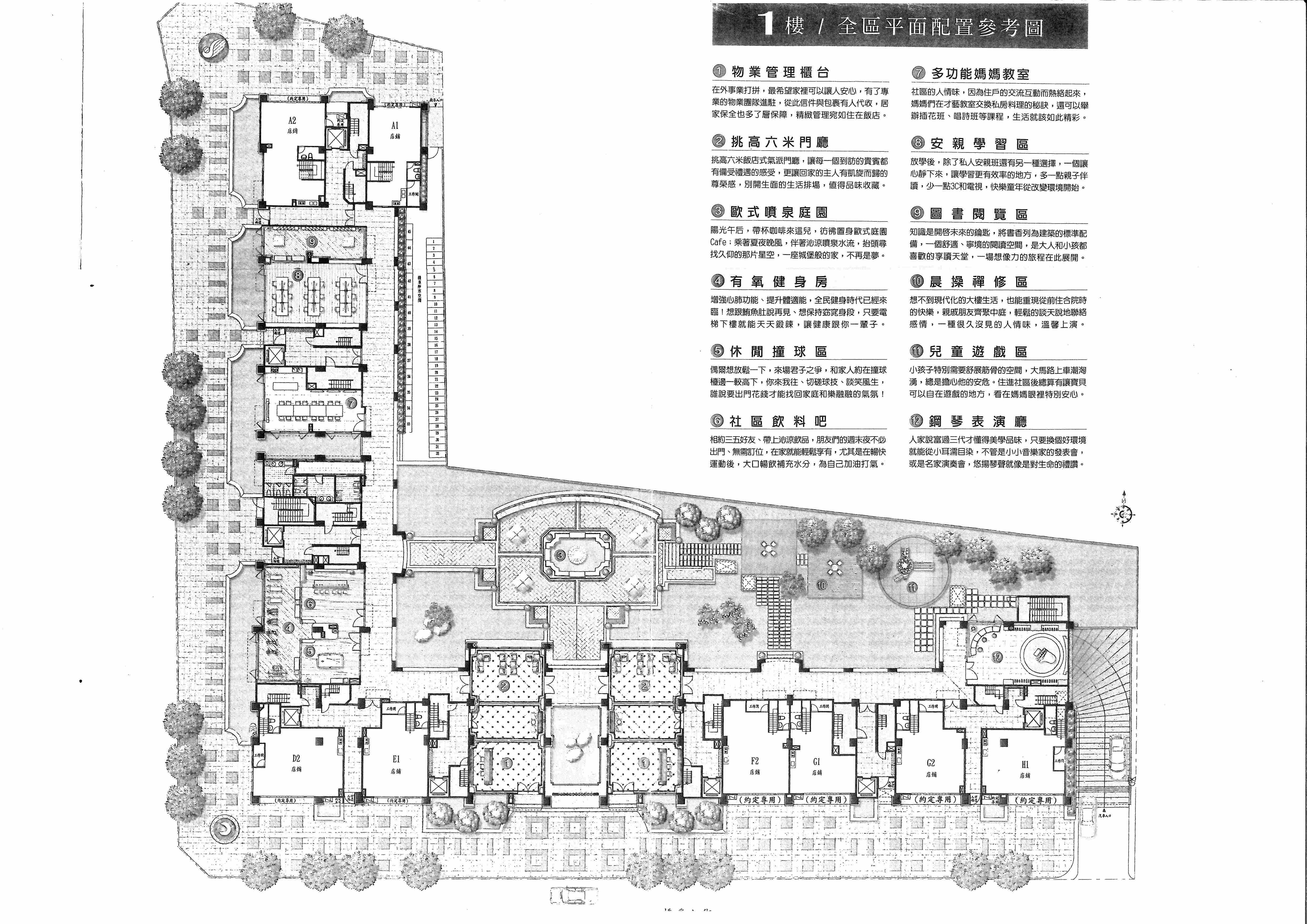 •公共設施:接待大廳、歐式中庭花園、交誼廳、閱覽室、健身房、桌球室、兒童遊戲區、廚藝教室、信箱區、禪修區、戀琴表演廳